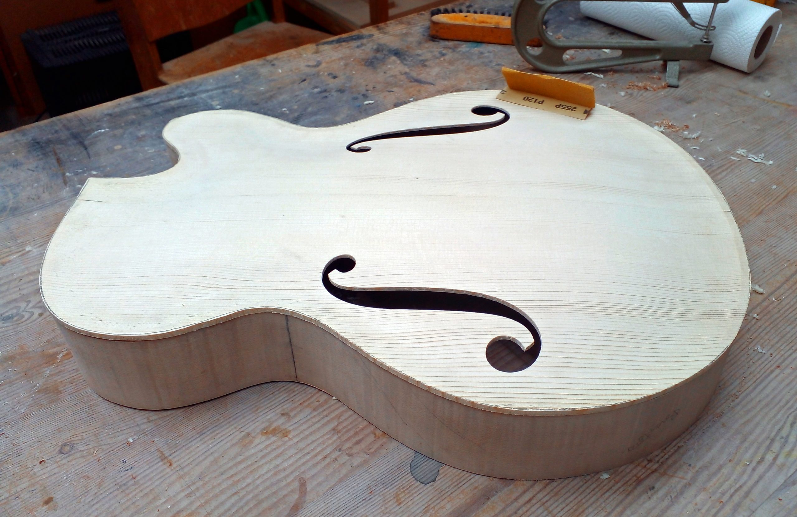 Also, today I received a first photo of the construction of my new archtop guitar from Theo Scharpach. The binding still needs to be applied to the top. The neck is partially finished, with 12th fret inlay in the fretboard. It’s a beauty!